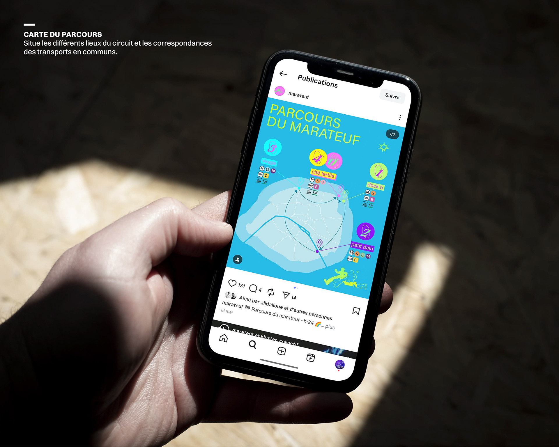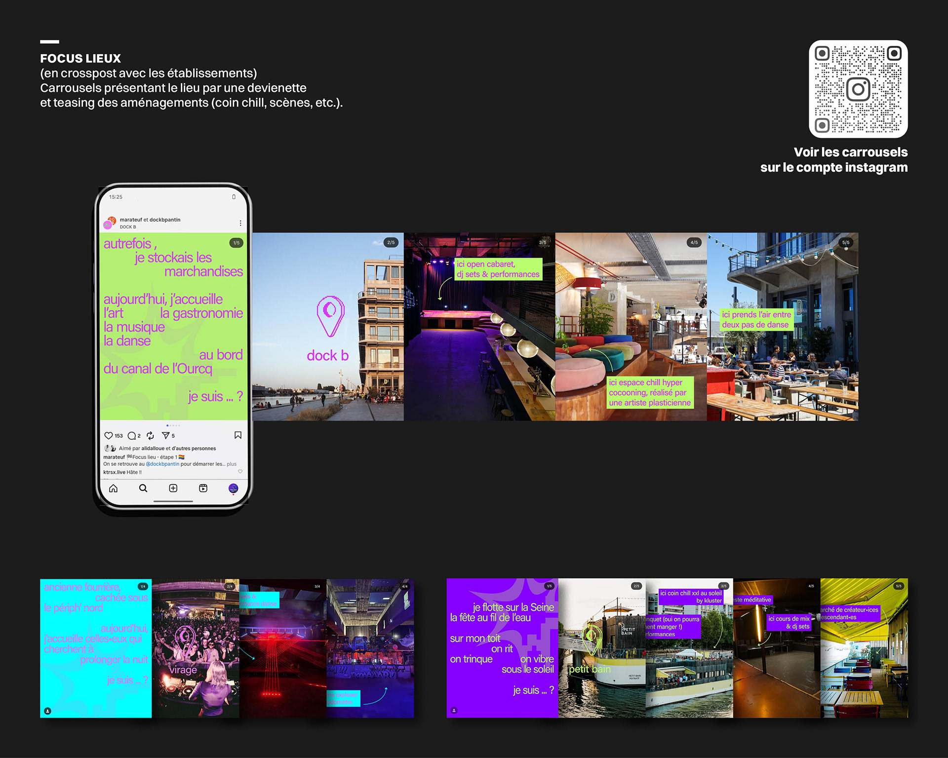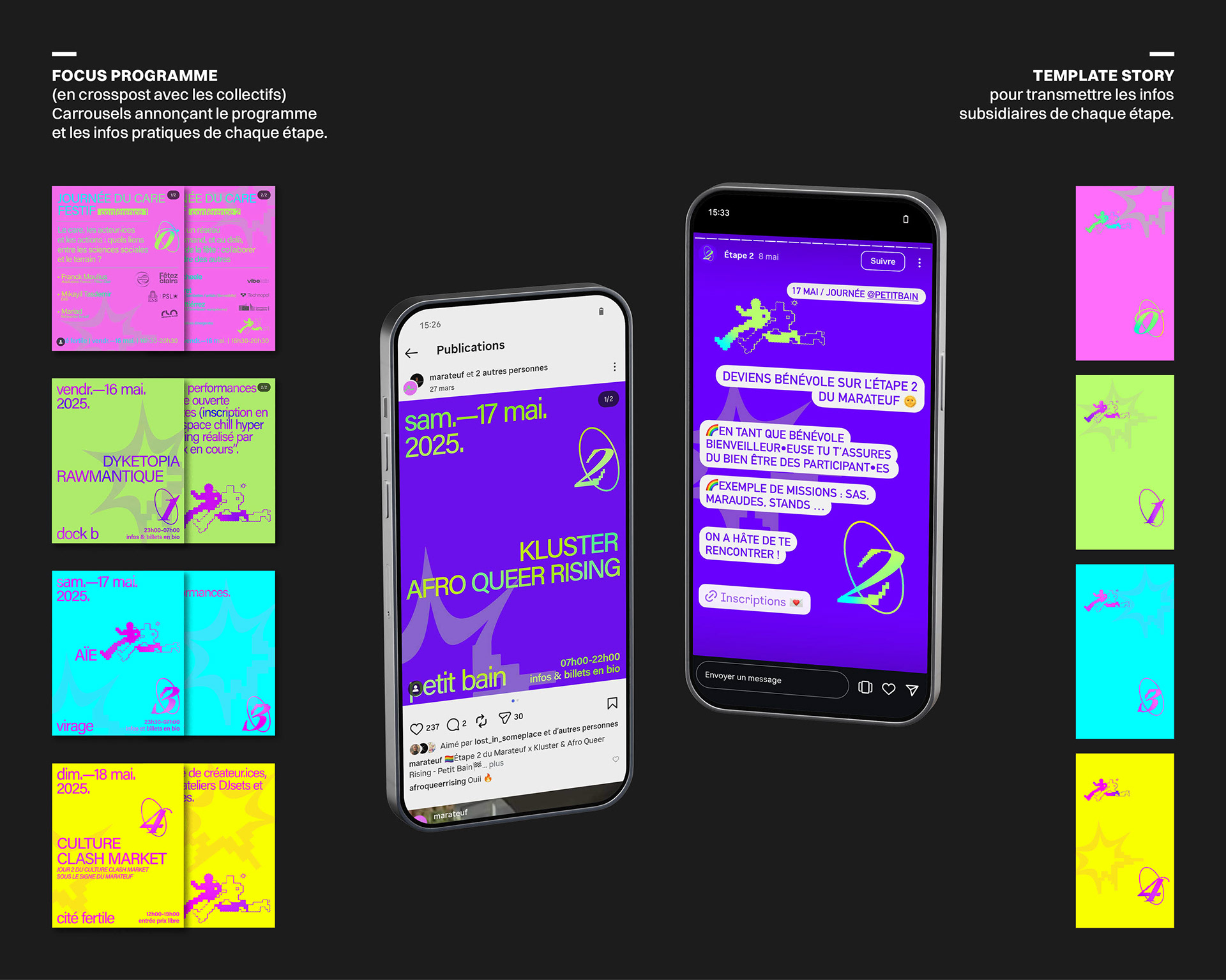 Pour sa 2ᵉ édition, Le Marateuf, festival queer célébrant la liberté et la bienveillance, a offert 42 heures de fête continue à travers cinq lieux parisiens. En collaboration avec l’association Kluster, une stratégie de communication digitale a été déployée, principalement sur Instagram, guidant les participants à travers chaque étape par un code couleur et une programmation en temps réel. Ce dispositif clair et vivant traduit l’énergie et l’esprit du Marateuf tout en amplifiant la visibilité des événements et du collectif.